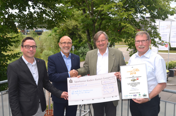 Foto (© Christian Fischer, honorarfrei): Dr. Marduk Buscher (2. v.r.) übergibt die Urkunde und einen symbolischen Scheck an die drei Vertreter des Caritasverbandes Baden-Baden, Frank Herzberger, Jochen Gebele und Sigisbert Raithel (v.l.n.r.).