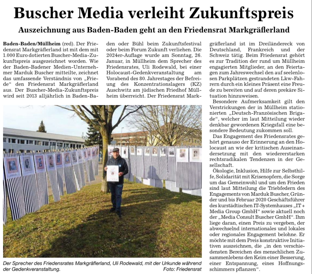 Der mit 1.000,- € dotierte 2024er „Buscher Media Zukunftspreis“ des Baden-Badener Medien-Unternehmers Dr. Marduk Buscher geht rückwirkend an den im südwestdeutschen Dreiländereck tätigen Friedensrat Markgräflerland.